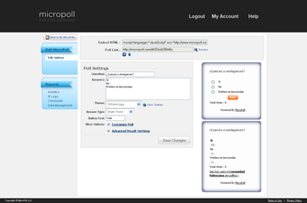 Para los más exigentes, Micropoll ofrece varias opciones para personalizar el tipo de encuesta, el número de respuestas posibles, si quien responda podrá ver los resultados, bloqueo de IP para evitar spam, etc.